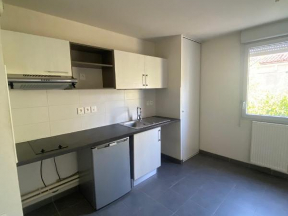 Un appartement de type 2 situé au premier étage du bâtiment B comprenant : un entrée, un séjour/cuisine ouverte équipée (un réfrigérateur top, une hotte aspirante et une plaque vitrocéramique deux feux) ouvrant sur un balcon, une salle de bains avec WC et une chambre avec placards.