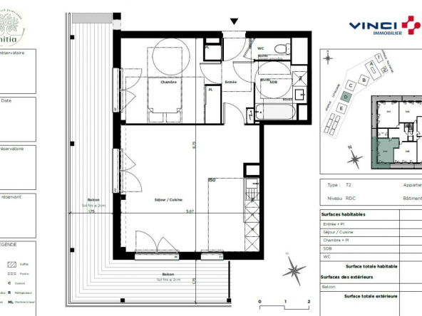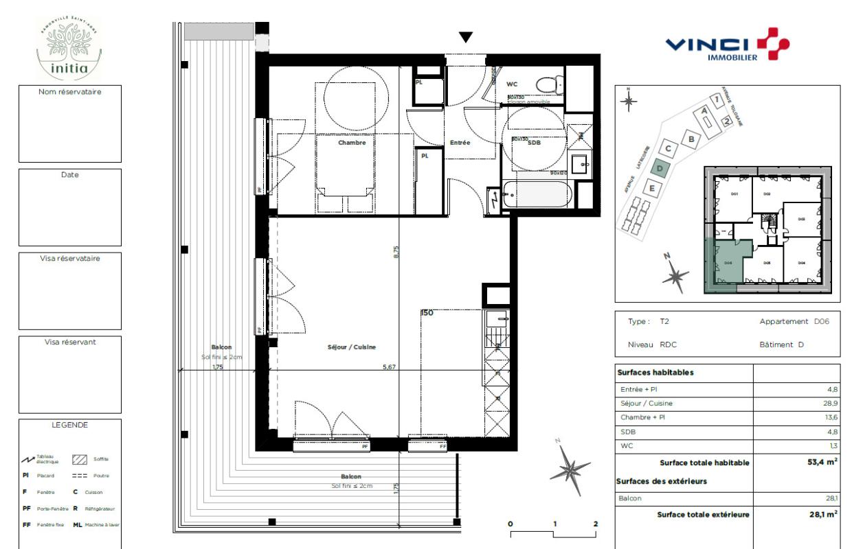 Situé au rez-de-chaussée du bâtiment D, cet appartement T2 de 53,40 m² séduit par ses volumes généreux et son agencement soigné.