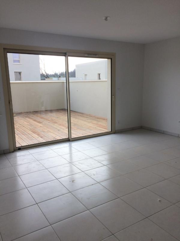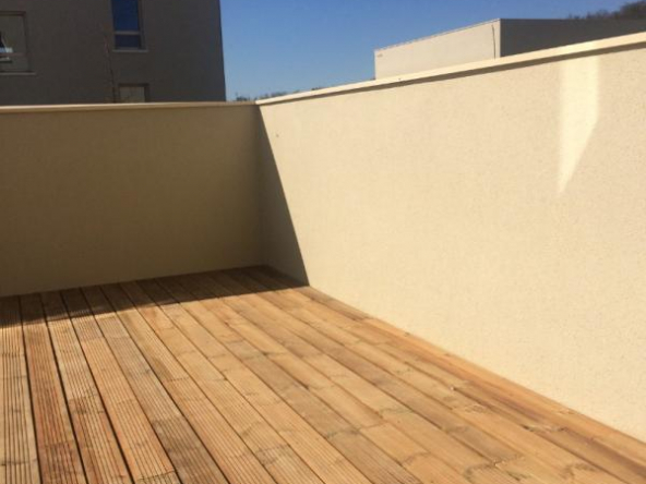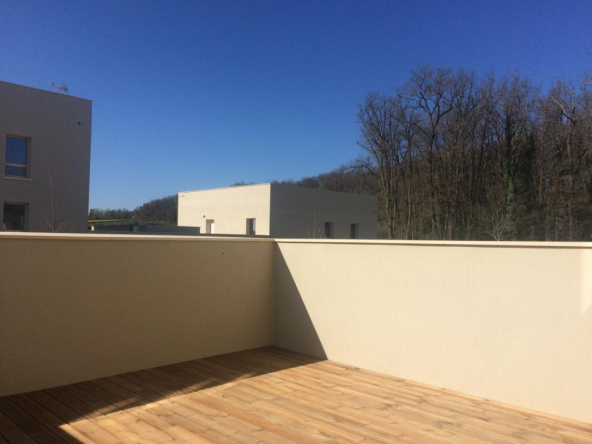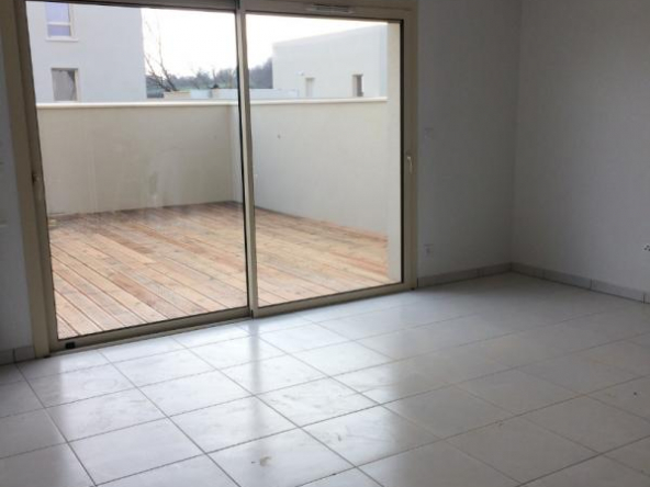 CORNEBARRIEU, ZAC de MONGES, un appartement de type 2 comprenant : un séjour avec coin cuisine équipée ouvrant sur une terrasse privative de 22 m2, un dégagement, une chambre avec placard, une salle d’eau avec wc, un parking couvert.