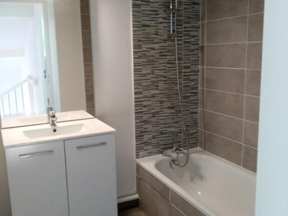 Un appartement de type T3 Duplex, au 1er étage, exposé Nord/Ouest de 63 m² comprenant au rez-de-chaussée: une cuisine entièrement équipée et aménagée (Meubles hauts et bas, plaque vitro quatre feux, hotte aspirante inox, évier résine, emplacement machine à laver/lave-vaisselle, emplacement micro-onde, emplacement réfrigérateur) ouverte sur un séjour donnant accès au balcon de 5 m², une salle de bains avec wc.