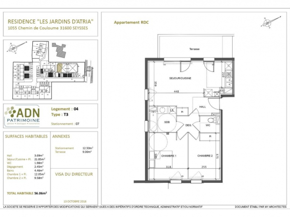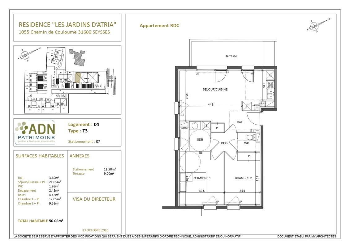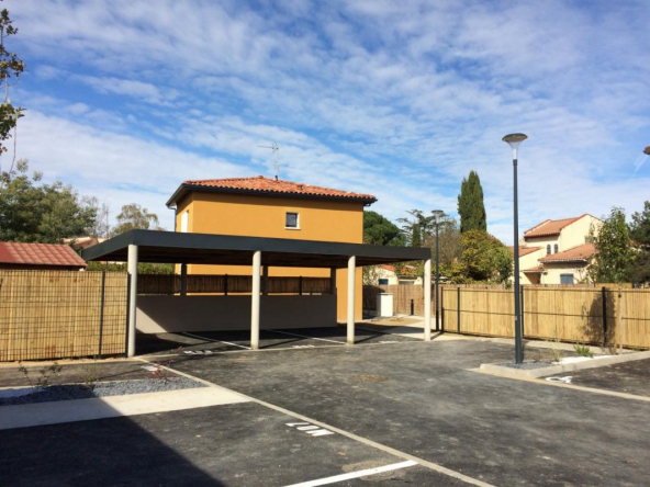 Un appartement de type 3 situé en rez-de chaussé comprenant un halle d’entrée, un séjour avec coin cuisine ouvrant sur une terrasse de 9 m2, un dégagement, deux chambres, une salle de bains, un wc, une place de parking aérien.