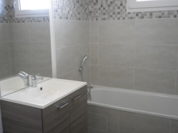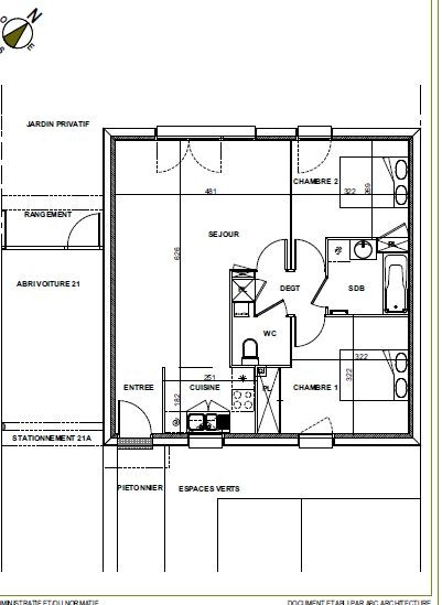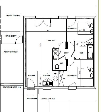 Villa de type 3 de plain-pied d’une superficie de 63.60 m² composée d’une entrée, un séjour avec coin cuisine, un dégagement avec placard, une salle de bains, un wc, deux chambres avec placard.